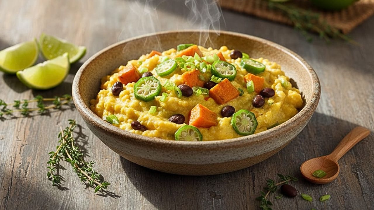 This nourishing take on Barbados' beloved cou cou elevates the traditional cornmeal and okra foundation with protein-rich black beans and antioxidant-packed sweet potatoes. Okra provides impressive nutrition including vitamins C and K, antioxidants, and fiber that supports heart health and blood sugar regulation, while sweet potatoes contribute beta-carotene and complex carbohydrates. This one-pot Caribbean classic delivers complete nutrition for longevity-focused eating, transforming a simple side dish into a satisfying, diabetes-friendly main course that celebrates Bajan culinary heritage..
